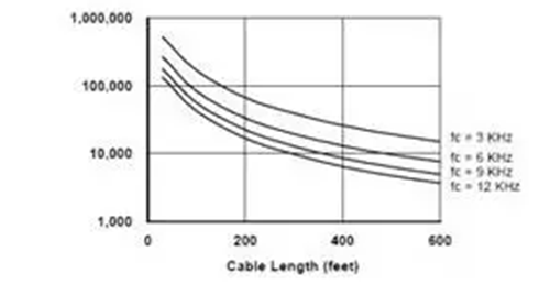 變頻器的載波頻率越高,輸出電流波形越接近正弦波,這會(huì)降低電機(jī)的運(yùn)行溫度,從而延長(zhǎng)絕緣的壽命。但是,更高的載波頻率意味著每秒鐘產(chǎn)生的尖峰電壓數(shù)量更多,對(duì)電機(jī)的沖擊的次數(shù)更多。圖4給出了絕緣壽命隨著電纜長(zhǎng)度與載波頻率的變化。從圖中可知,對(duì)于200英尺長(zhǎng)的電纜,當(dāng)載波頻率從3kHz提高到12kHz(變化4倍)時(shí),絕緣的壽命從大約8萬小時(shí)降低到2萬小時(shí)(相差4倍)。